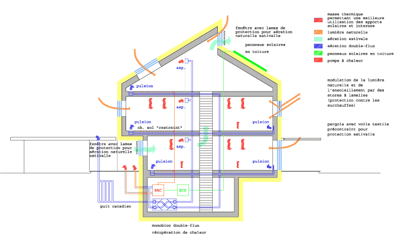 - La restitution de chaleur est assurée par l’air de renouvellement pour les locaux Sud et Ouest et par des zones restreintes de chauffage de sol situées dans les parties Nord et salles de bains